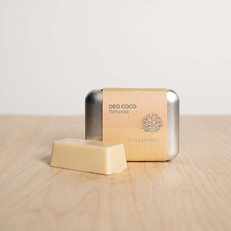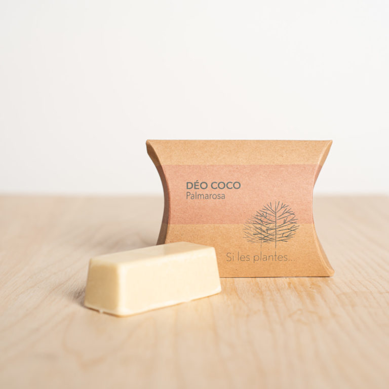 Ingrédients (INCI) : Cocos Nucifera Oil, Sodium Bicarbonate, Zea Mays Starch, Copernicia Cerifera Wax, Palmarosa Herb Oil, Geraniol, Limonene, Linalol.